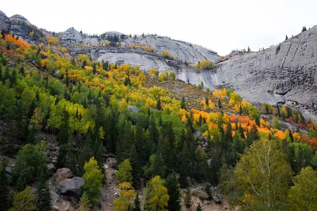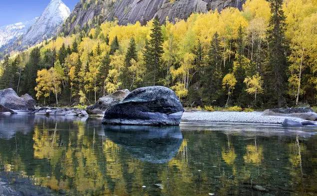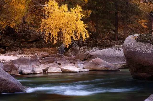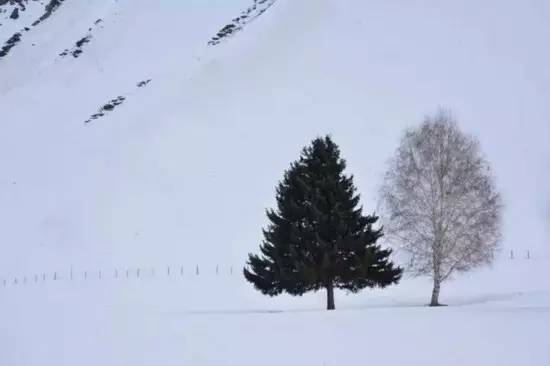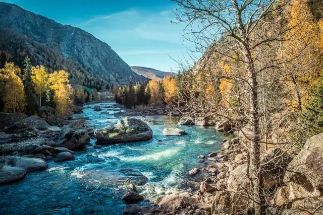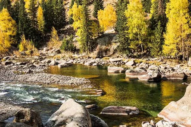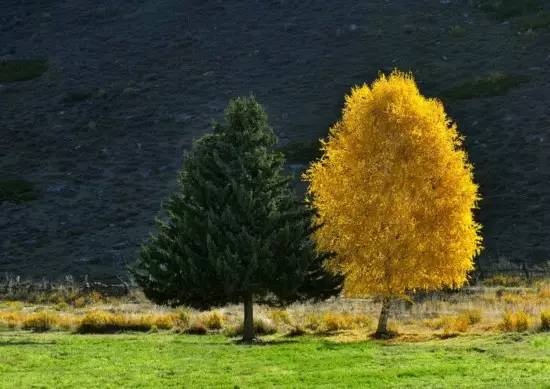 这两颗树便是可可托海的“夫妻树”。它们并肩而生,春夏季节都是一样的碧色欲滴。秋天,一颗变黄,一颗依旧青翠,相映成趣。