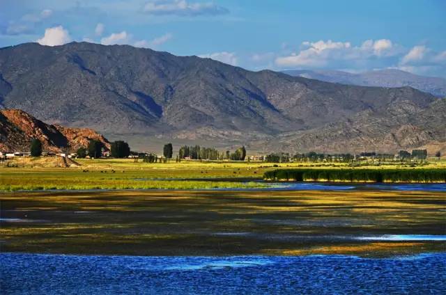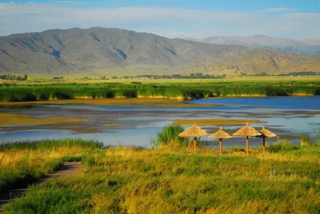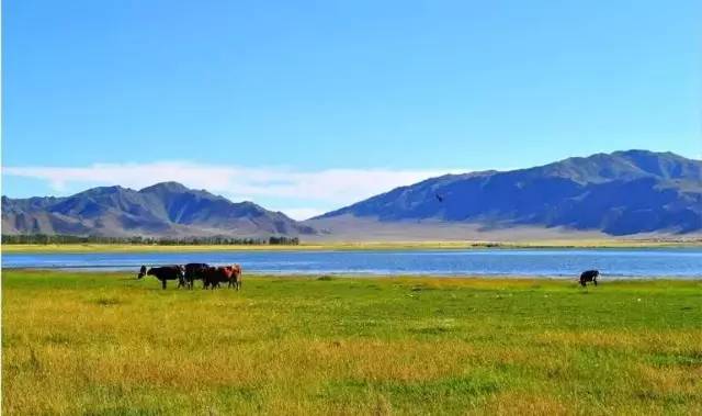 远远望去,水边绿草如盖,野花盛开,牛羊成群,午后的阳光下,哈萨克牧民的毡房炊烟袅袅,宛如一幅边塞牧歌图。