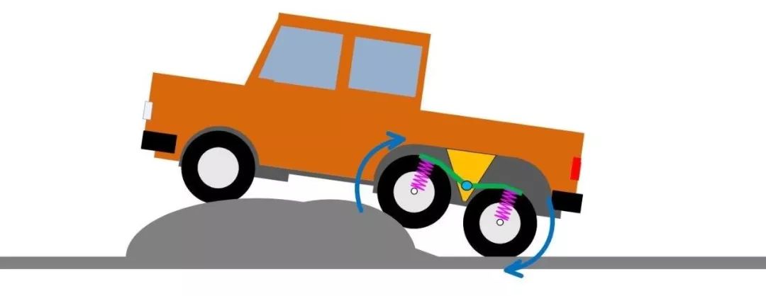 简单来说就是两个同侧轮以图中的黄色支臂为中心点进行前上后下或前下后上运动,当中桥的悬挂被压缩的时候,后桥的悬挂则会往反方向延伸以保证车轮能接触地面,反之亦然。