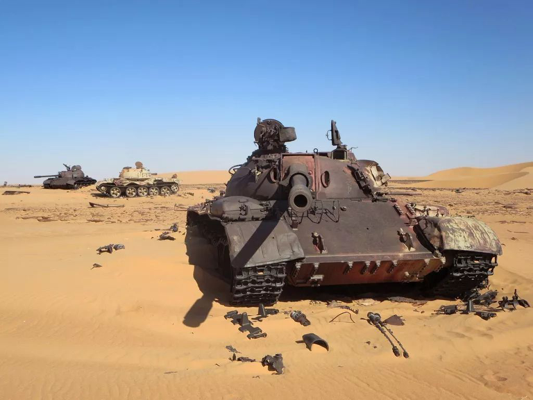 三辆损毁在沙漠中的利比亚T-55坦克