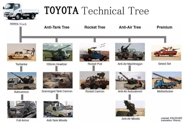 当然,利比亚与乍得之间的这次“皮卡战争”,仅仅算是一次低量级的战斗。在车辆性能上,高防护性与高机动性本来就是两个不可调和的词。但乍得军队依靠机动性更强的主力“战车”——皮卡,全歼了利亚比一个装甲旅的战绩,如果丰田皮卡会说话,那这战绩足够它吹好几百年。在中东甚至有一句话:“只要皮带好机油还在,丰田皮卡就能带你去任何地方”。