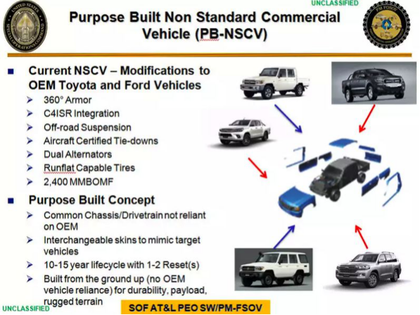 重点是,这些车辆的车身将有“可互换的外形”,经过简单的处理以后,可以使其在必要时看起来像福特Ranger或丰田皮卡或者SUV。SOCOM表示,最简单的标准就是,当这些车辆以每小时35英里或以上的速度行驶时,需要在100米开外从外观上看起来与普通民用车没什么差异。