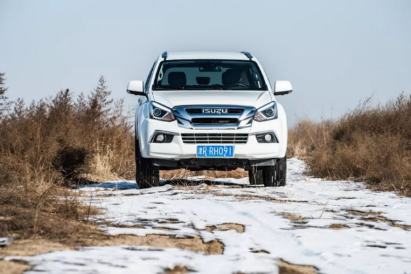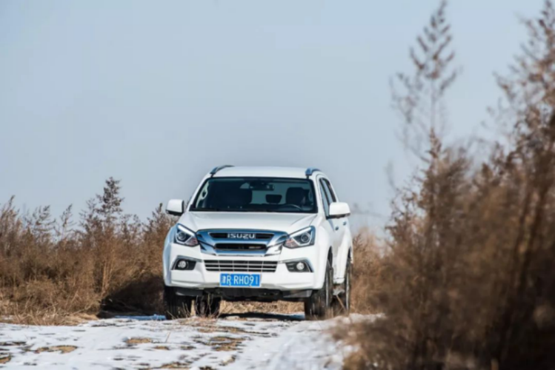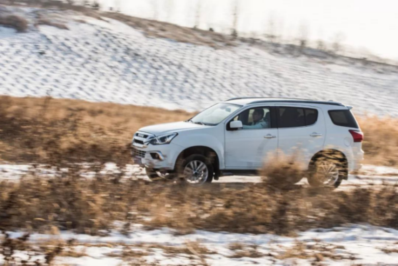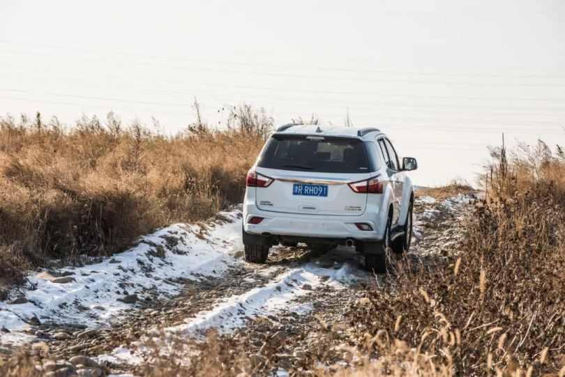越野性能方面,非承载式车身、分时四驱、伊顿差速锁、26°接近角以及21°离去角让mu-X具备了良好的基础素质。在潮白河的河滩中我们对其越野性能做了个简单的测试,只有在面对大型交叉轴以及湿滑的冰面时需要打开四驱慢速通过,而当面对像碎石路、炮弹坑等越野路况时,mu-X虽然配备的是一款偏向城市通勤、越野性能并不算太过出众的玛吉斯HP-M3轮胎,但依旧可以仅凭借两驱就可以轻松化解诸多障碍。