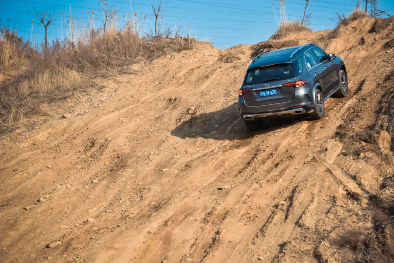 为了更直接检测GLE的四驱能力,直接开到此前我们经常用来评测硬派越野车的一处陡坡面前,这也是经常有越野爱好者探索激情的地方,也是普拉多、途乐,帕杰罗、小切诺基驰骋的乐园。陡坡不长,落差十余米,坡面沙土结合碎石,附着力一般,对于没有AT胎的GLE来说算是不小挑战。