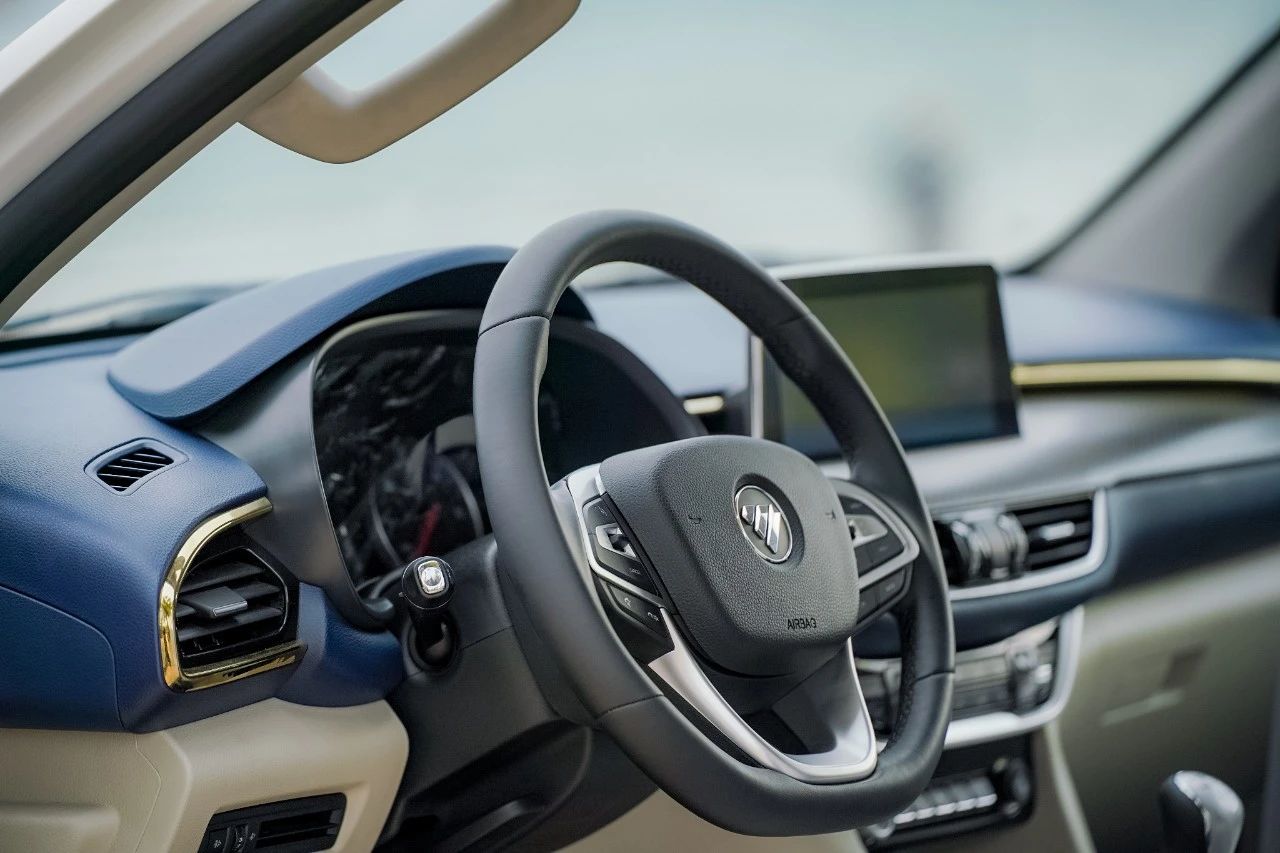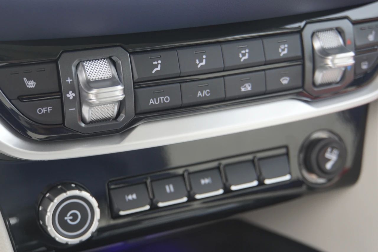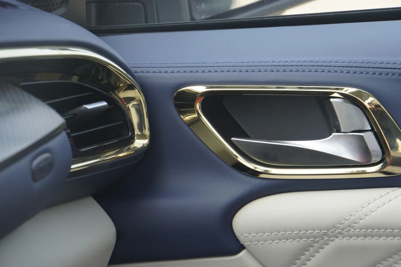 蓝白拼色和大面积皮饰(还带缝线)的确营造出来了不错的质感。很多自主品牌喜欢把很多东西东拼西凑到一起,往往显得格格不入,反而给人不上档次的感觉。大将军不会给你这种感觉,说明它的内饰是经过精心设计的,禁得起推敲的——设计师甚至大胆地给仪表台和车门拉手都镶了金边儿,但看上去还是挺有质感的。