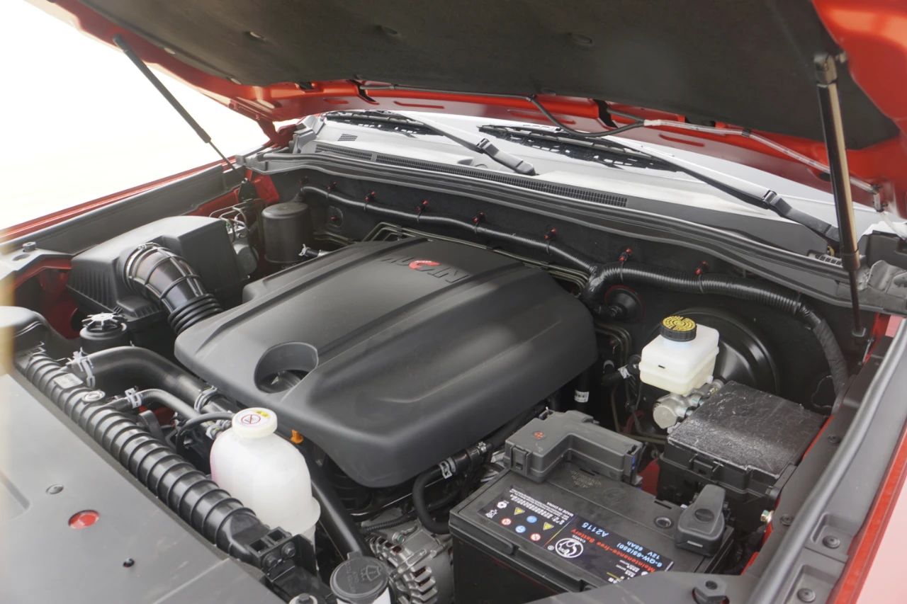 大将军的发动机舱看起来很工整。其动力系统非常值得一提:三款发动机分别为来自五十铃的2.5T和技术来自康明斯的欧康动力2.0T汽油/柴油发动机。其最大功率和扭矩分别能够达到175kW/390N·m,着实不小。此外,6MT/ZF 8AT的变速箱也值得信赖。