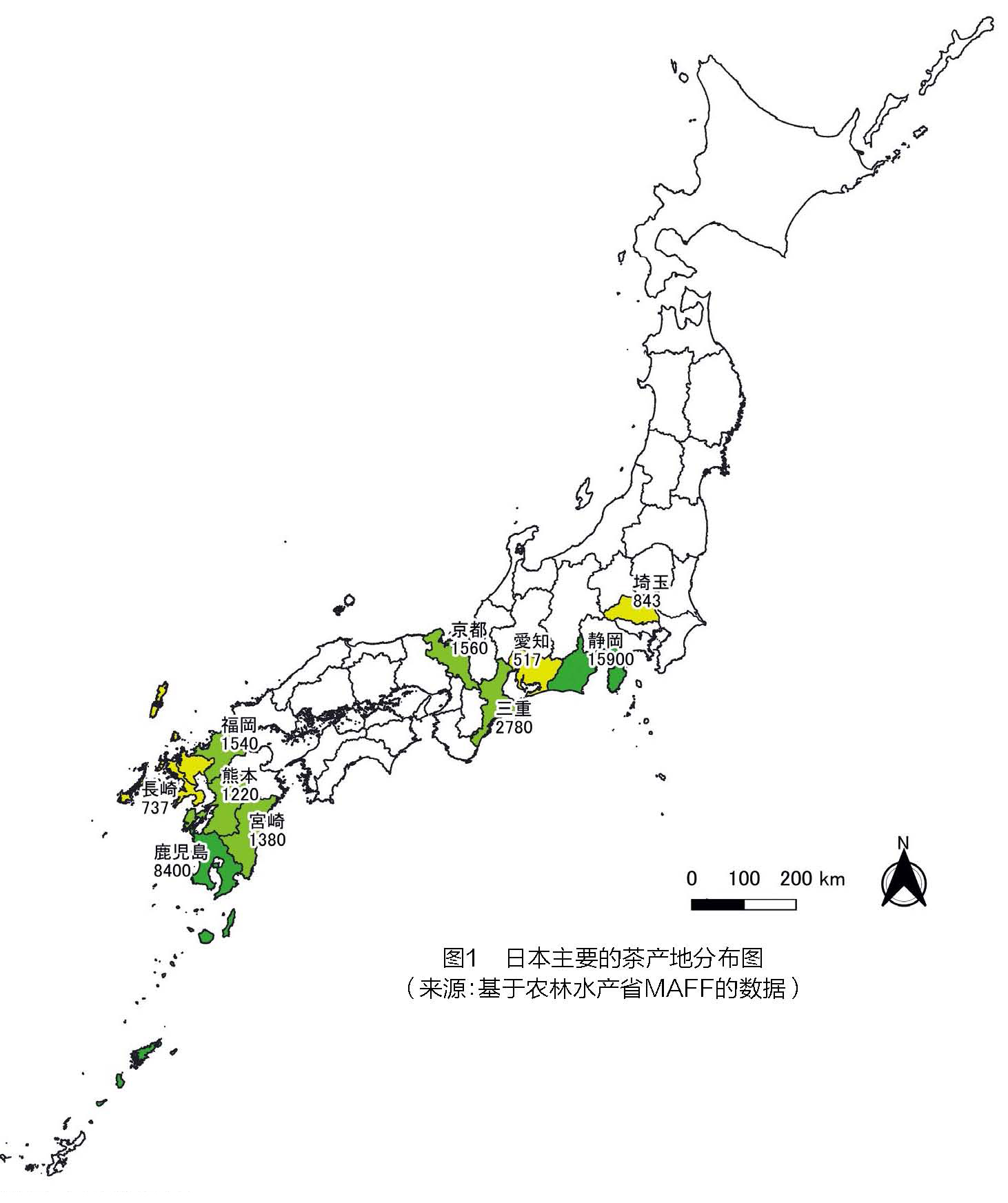 截至2019年,根据日本农林水产省(MAFF)的 统计,日本国内种茶面积共40600 hm2。日本的47个县中(图1),主要有11个的产茶县,按种植规模大小排序,静冈、鹿儿岛、三重、京都、福冈、 宫崎、熊本、琦玉、佐贺、长崎、爱知。
