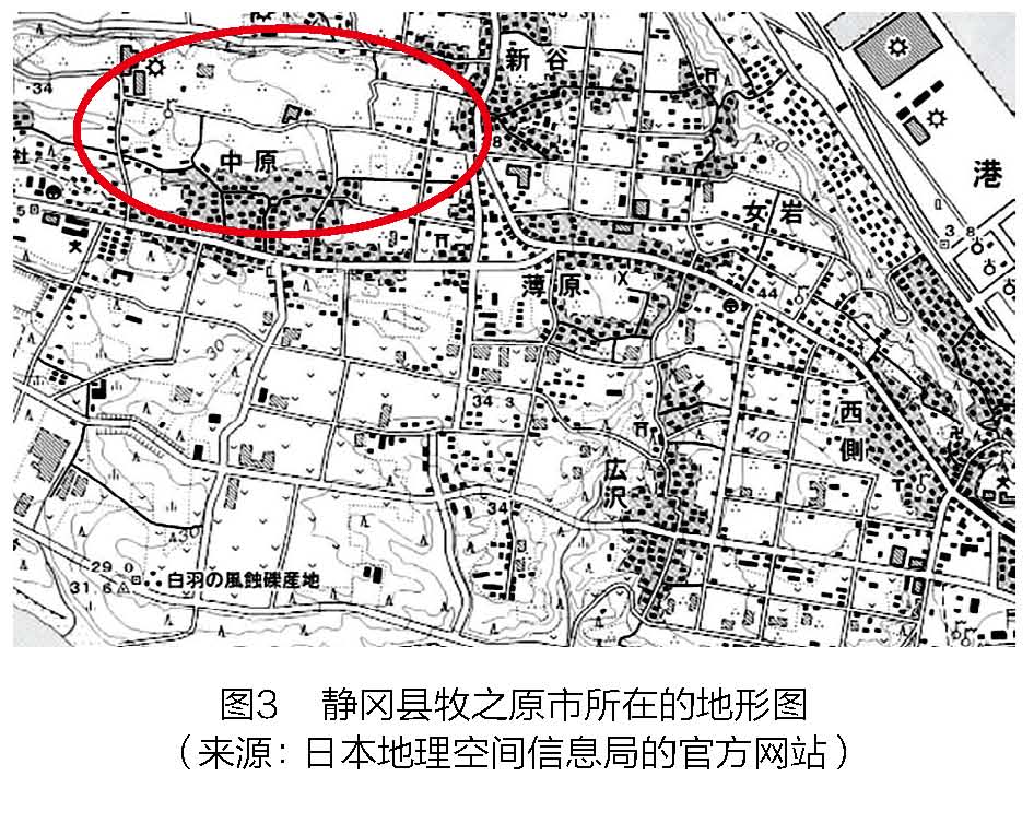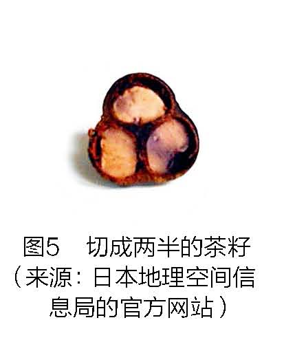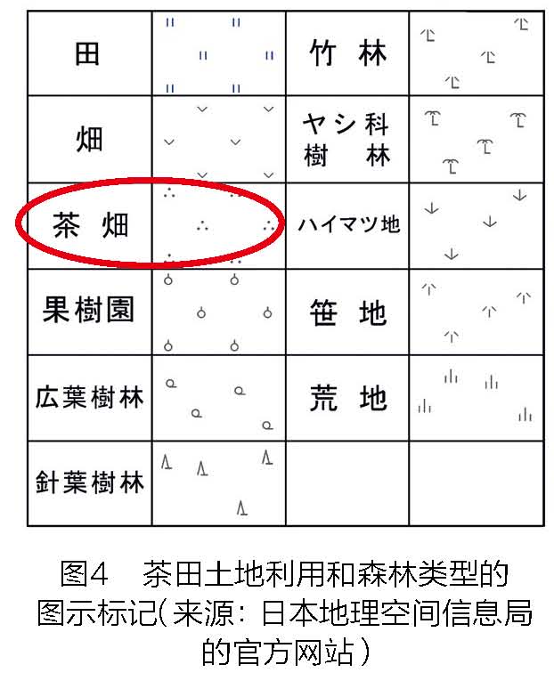 稻田间的田埂上,种植着成排的茶树;甚至在果园或者桑葚园里,也能见到零星的茶树。实际上不管在多么奇怪的地方,只要有空间,茶树就见缝插针地生长。在茶田在日本的地形图里面,用3个点来标记(3个点的形状就像是茶种子从中间劈开的样子)(图3~图5)实际上,与中日两国非常熟悉的稻田、农田、果园等类似,日本官方地形图上所标记的茶田也是一种常见的土地利用形式,而且它更加反映出该地区的文化和社会特征。这就像是法国等主要葡萄酒生产国在地图上标记出葡萄园,以及德国等啤酒主要生产国标记的啤酒花一样。
