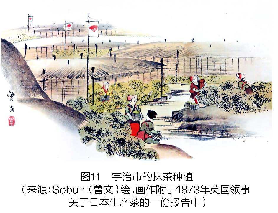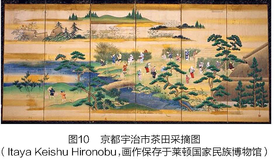 茶景观也备受日本艺术家的青睐,他们创作出一系列描绘采茶和制茶的屏风或画卷作品。其中一些画作被西方收集并收藏,见证了日本独有的茶田景观。图10是1840年至1850年之间的一幅屏风画,描绘了日本的茶景观(在京都宇治市茶田里采摘)。图11是本地艺术家Sobun的9幅画作之一,描绘了当时宇治市的抹茶种植。