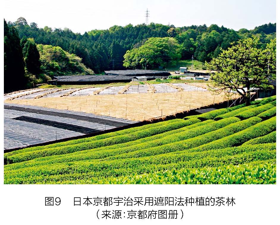 这增加了日本(尤其是宇治)茶景观的独特之处, 并且至今仍是一个独特的景观,使其明显区别于世界其他地方的茶景观。1577年,葡萄牙传教士若奥·罗德里格斯(Joao Rodorigues)对这种景观有如下描述:“在产出最高品质茶叶的宇治市,所有茶田都在使用稻草或茅草制成的遮阳篷或垫子。这些保护措施使得每年2月初至3月底新萌发的嫩芽避免遭受霜冻”(图9)。