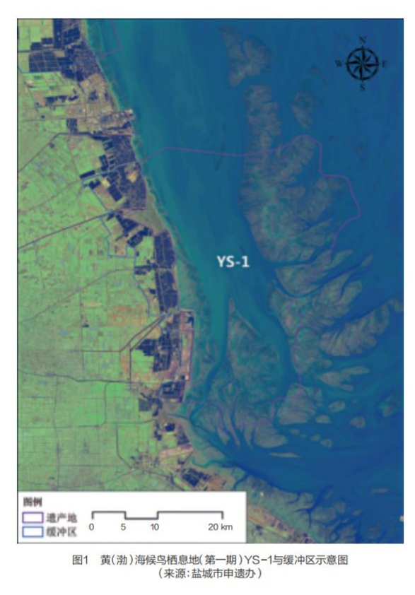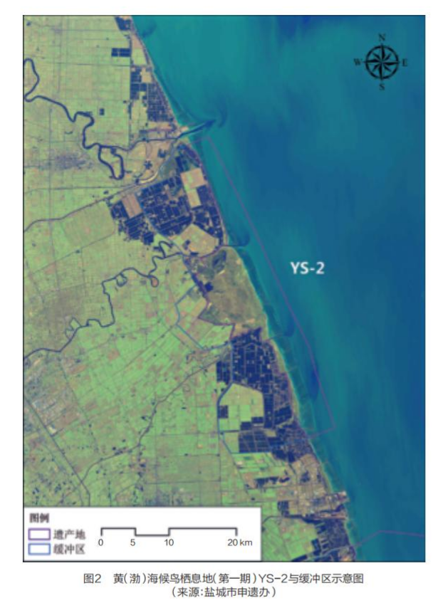 此次申遗成功的第一期是中国第一块滨海湿地类世界自然遗产,是继瓦登海后的全球第二块潮间带世界自然遗产。由于该遗产地位于江苏省盐城市,故下文简称为盐城黄海湿地遗产。第一期申报项目包括江苏大丰麋鹿国家级自然保护区、江苏盐城湿地珍禽国家级自然保护区南段及东沙实验区和江苏盐城条子泥市级湿地公园共同组成的第一块遗产地(YS-1)(图1),江苏盐城湿地珍禽国家级自然保护区中段构成第二块遗产地(YS-2(图2)。其中,盐城湿地珍禽国家级自然保护区、大丰麋鹿国家级自然保护区的部分区域和东台条子泥市级自然保护区为开放展示区。