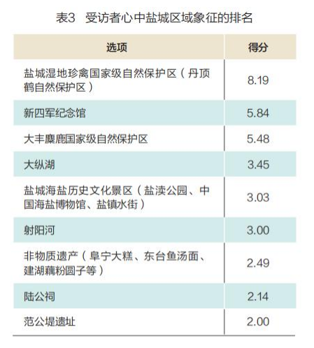 调查问卷回收结果显示,盐城湿地珍禽国家级自然保护区与大丰麋鹿国家级自然保护区在受访者心中占据重要地位。尤其是以丹顶鹤闻名的湿地珍禽国家级自然保护区,以8.19的得分遥遥领先(表3)。此处得分的计算方法为:选项平均综合得分= (Σ 频数×权值)/本题填写人次。
