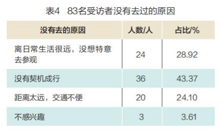 在200名调查者中被问及“是否去过遗产地的湿地珍禽自然保护区与大丰麋鹿自然保护区”时(表4),有39人表示去过3次及以上,78人去过1~2次,80人没去过但一直想去,还有3人没去过也对此不感兴趣。从未去过黄海候鸟栖息地的受访者有83人,占41.50%,占比较大。在83名当中,“没有契机成行”(43.37%)、“离日常生活很远,没想特意去参观”(28.92%)、“距离太远,交通不便”(24.10%)和“不感兴趣”(3.61%)是本地人未曾前去参观的原因。