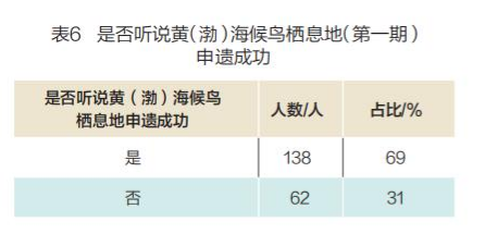 截至2020年年初,200名受访者中有138人听说过黄海湿地申遗成功。然而,近1/3的人并未听说这条新闻,或者并没有将世界自然遗产与“家门口的”自然保护区联系起来(表6)。