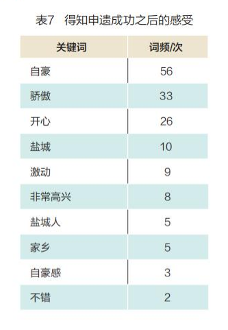 绝大多数人在得知申遗成功后感到“骄傲”“自豪”“开心”。85%的人认同申遗成功这一事件维护与强化了作为盐城本地人的身份认同和地区归属感兴趣”(3.61%)是本地人未曾前去参观的原因。34感。95%的人认为自己有责任在现在与未来,直接或间接地参与保护黄海湿地,占受访者的绝大多数(表7)。