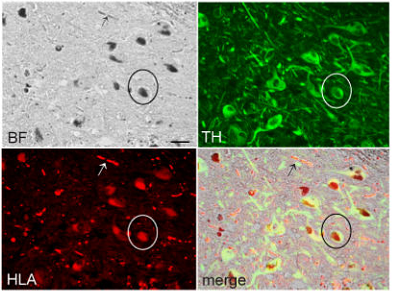 图2 黑色圆圈标注部分说明黑质部位的神经元(绿)上存在HLA(红)蛋白分布[1]