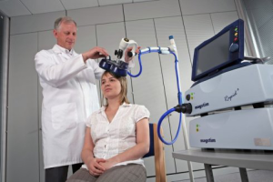 经颅磁刺激(TMS)是一项无创无痛、有效刺激大脑皮层的新方法,由Barker于1985年首先提出并应用于人体。经颅磁刺激器由两部分组成:产生快速变化电流的电路部分(包括电容充/放电系统和控制系统)和产生时变磁场的线圈。这两者通过电缆连接,储存在电容器里的能量经信号触发后释放到线圈里。TMS的作用原理在于通过时变磁场诱发出感应电场,即法拉第磁效应。简单来说,一个快速电流脉冲通过刺激线圈,产生强大的瞬间磁场(约1~4T),该磁场几乎不衰减地通过头皮和颅骨,在大脑皮层功能区的神经组织产生环形感应电流,使神经细胞去极化。其最终效应既可以引起暂时的大脑功能的兴奋或抑制,也可以引起长时程的皮层可塑性的调节。经颅磁刺激技术除了可应用于脑部刺激之外,脊髓神经根及外周神经的磁刺激。因为该技术具有功能方面的独特性和无创、无痛、操作简便及安全可靠等优点,因此很快被推广到临床和科研的各个领域。并与PET(正电子发射型计算机断层显像)、FMRI(功能核磁)、MEG(脑磁图)并称为“二十一世纪四大脑科学技术”。