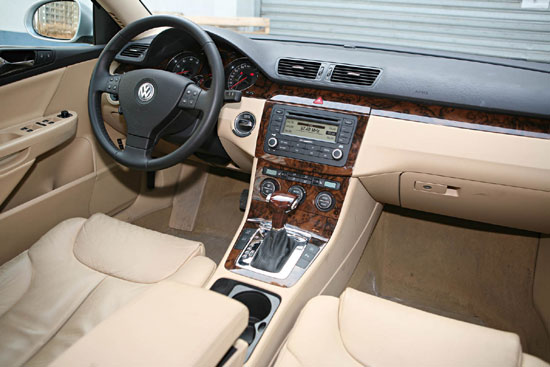 先来比较一下两款车型在尺寸上的硬性指标,首先在车身尺寸上,外形强调动感的致胜居然要比迈腾大一圈,其4 854 mm×1 886 mm×1 495 mm的长宽高要比迈腾分别大出了89 mm、66 mm和23 mm。而在对车内空间起到决定性因素的轴距尺寸上,蒙迪欧致胜长达2 850 mm的尺寸更是比迈腾的2 709 mm多出了141 mm,惊人的数字!不过据说一汽-大众会参照奥迪A6推出加长版的做法,将来也会推出长轴距的迈腾车型,那都是后话了,还是看眼前的表现吧。不过好在在PQ46平台上诞生出来的迈腾采用了发动机横置的结构布局,所以后排座椅空间宽敞与较短的轴距也就并不矛盾了。通过实际的测量,在最为关键的后排座椅空间一项上,迈腾却并没有带来轴距上反映出的较大差异,腿部空间只比致胜少了50 mm,头部则仅仅少了30 mm。不过,即使是这样,迈腾后排座椅的头部和腿部空间也足够作为商务载客所用,而且配合其浅色内饰所带来的发散视觉效果,实际乘坐起来并不会感觉比致胜小。致胜则由于黑色内饰在视觉上营造的收敛效果,虽然实际的尺寸绝对达到了B级车的要求,甚至已经接近C级车的标准,但是坐在里面并没有感觉比迈腾宽敞多少。
