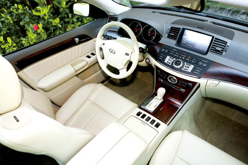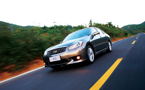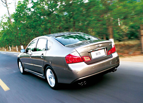 英菲尼迪的大部分车型全部配备了日产经典的VQ35发动机系列,M35同样不例外,但是不同的调校使其在动力性能上有着自己的特性。英菲尼迪给了M35的发动机206 kW的最大功率和363 N•m的最大扭矩输出,尤其是扭矩输出,竟然比G35还要多出5 N•m,造就了M35近乎“永恒”的加速性能,从静止加速的那一刻起,一直持续到中国所有道路法规所能够接受的极限车速,M35都可以随时随地的带来推背感,即使是在我们进行试车的一段安全道路上,车速已经超过了160 km/h,此时如果继续猛然深踩油门踏板,驾乘人员同样能够从椅背上感受到车身速度的激突变化。椅背的压力直到车速达到200 km/h才开始逐渐降低,而我们测试到的最高车速是230 km/h。此时M35变速器的手动换挡模式则严格遵循“手动定律”,如果驾驶者的手上没有任何动作,那么M35会在急加速的过程中永远保持着7 000 r/min的低吼声——没错,就是7 000 r/min!而且M35的方向盘也被调校成运动型的,随着车速的增加,转向力道会不断变沉,安全的同时,也保证了充足的路感。