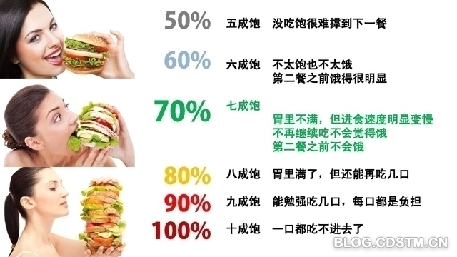 七成饱,大部分人找不到这个点,经常把胃里感觉满的八成饱当成最低标准,甚至到了多吃一口就觉得胀的九成饱。