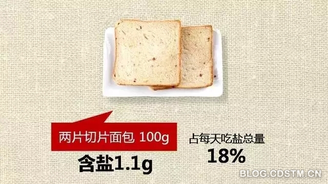 两片切片面包含盐1.1g,占每天吃盐总量18%。