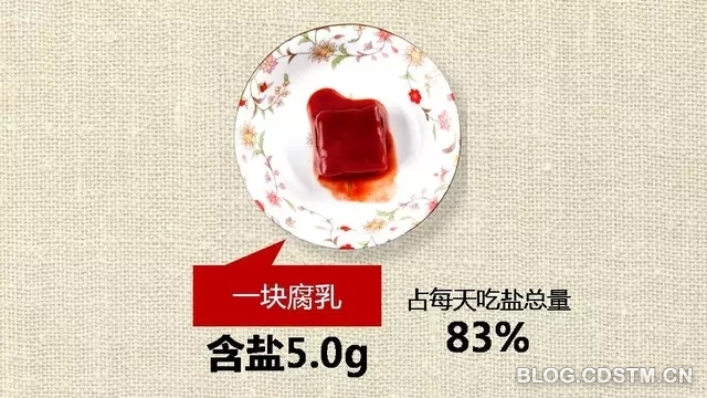 一块腐乳含盐5.0g,占每天吃盐总量83%。