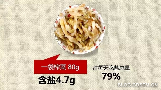 一袋榨菜含盐4.7g,占每天吃盐总量79%。