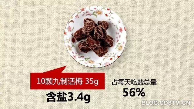10颗九制话梅含盐3.4g,占每天吃盐总量56%。