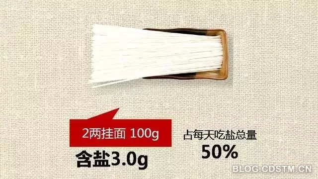 2两挂面含盐3.0g,占每天吃盐总量50%。