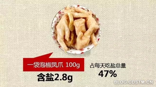 一袋泡椒凤爪含盐2.8g,占每天吃盐总量47%。