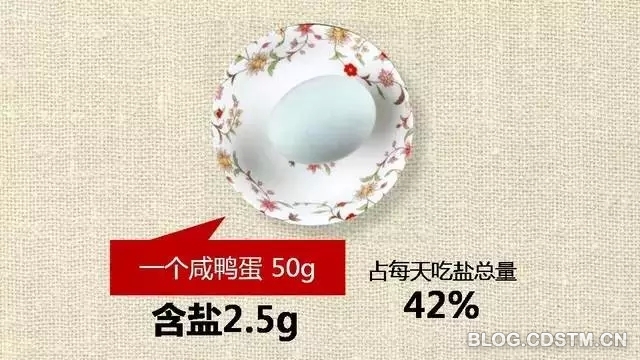 一个咸鸭蛋含盐2.5g,占每天吃盐总量42%。