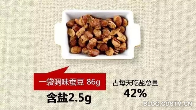 一袋调味蚕豆含盐2.5g,占每天吃盐总量42%。