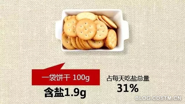 一袋饼干含盐1.9g,占每天吃盐总量31%。