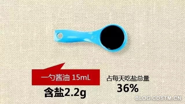 一勺酱油含盐5.0g,占每天吃盐总量36%。