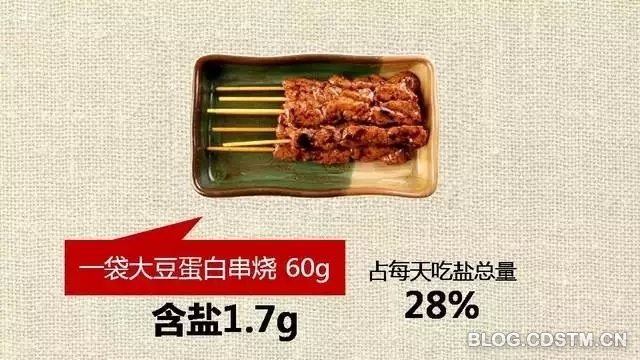 一袋大豆蛋白串烧含盐1.7g,占每天吃盐总量28%。
