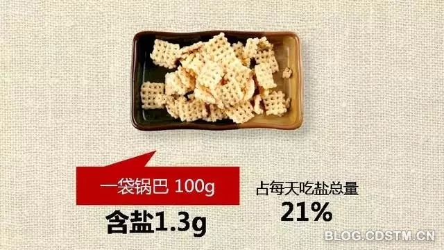 一袋锅巴含盐1.3g,占每天吃盐总量21%。
