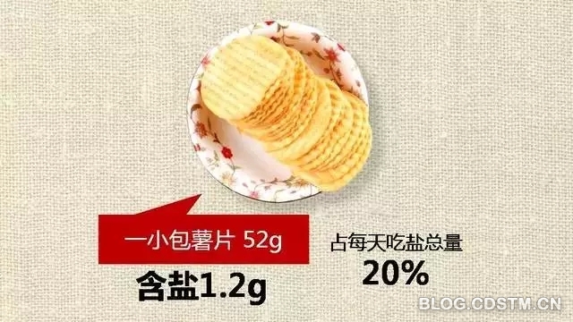 一小包薯片含盐1.2g,占每天吃盐总量20%。