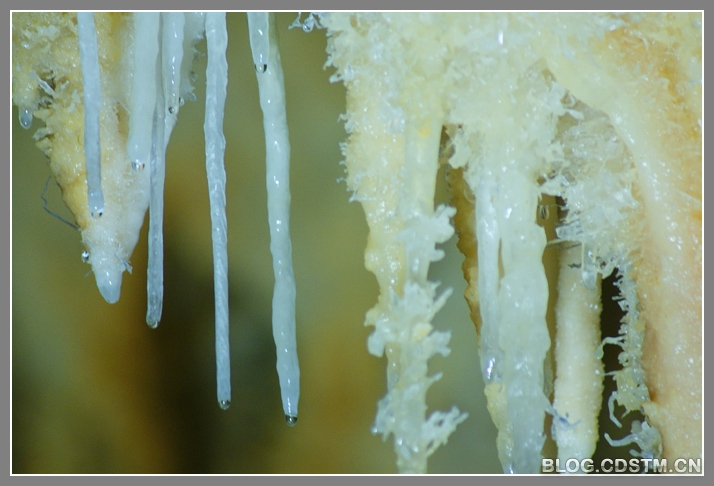 这个溶洞最有名的是透亮且还在滴水的鹅管石,还有从桔红或黄色的石板上长出的针状细管,惟妙惟肖。而且这些景观是别的溶洞里难得一见的。我曾写一首诗以纪之——