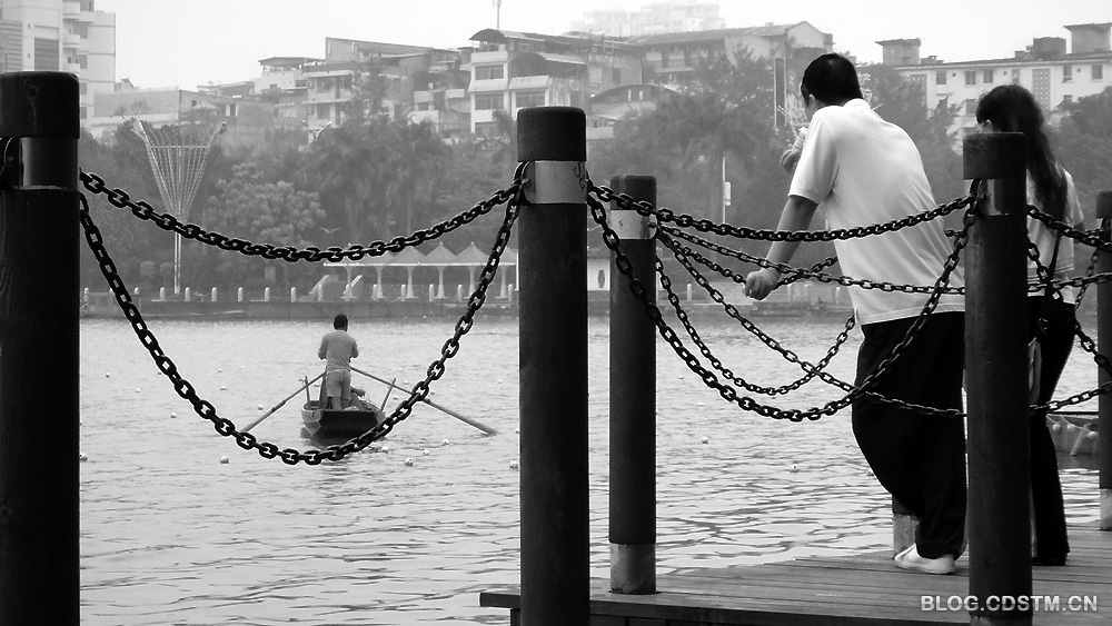 南湖是南宁的著名景点。4月18日清晨,在阴沉的湖面上,工作人员在撑船捕鱼。这组图利用观景台的防护链作前景,待船划进“嘴”中时,便将其定格下来,力求达到“嘴”里撑船的效果。