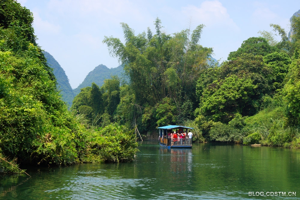 2013-09-22 16:18:47 2013年9月21日,我随团到广西大新县雷平镇安平村观光。上午7点40分从南宁出发,中午11点到达(2个多小时的高速路和1小时的二级路)。在村里稍休息后,就上船游览风光如画的黑水河。虽说是黑水河,但河水却非常清澈、碧绿。沿岸竹影婆娑,一群白鹭在河边盘旋,极富诗情画意。久不久看到几株高大的枯树立在近岸的水中,似是在检阅游览的客人。