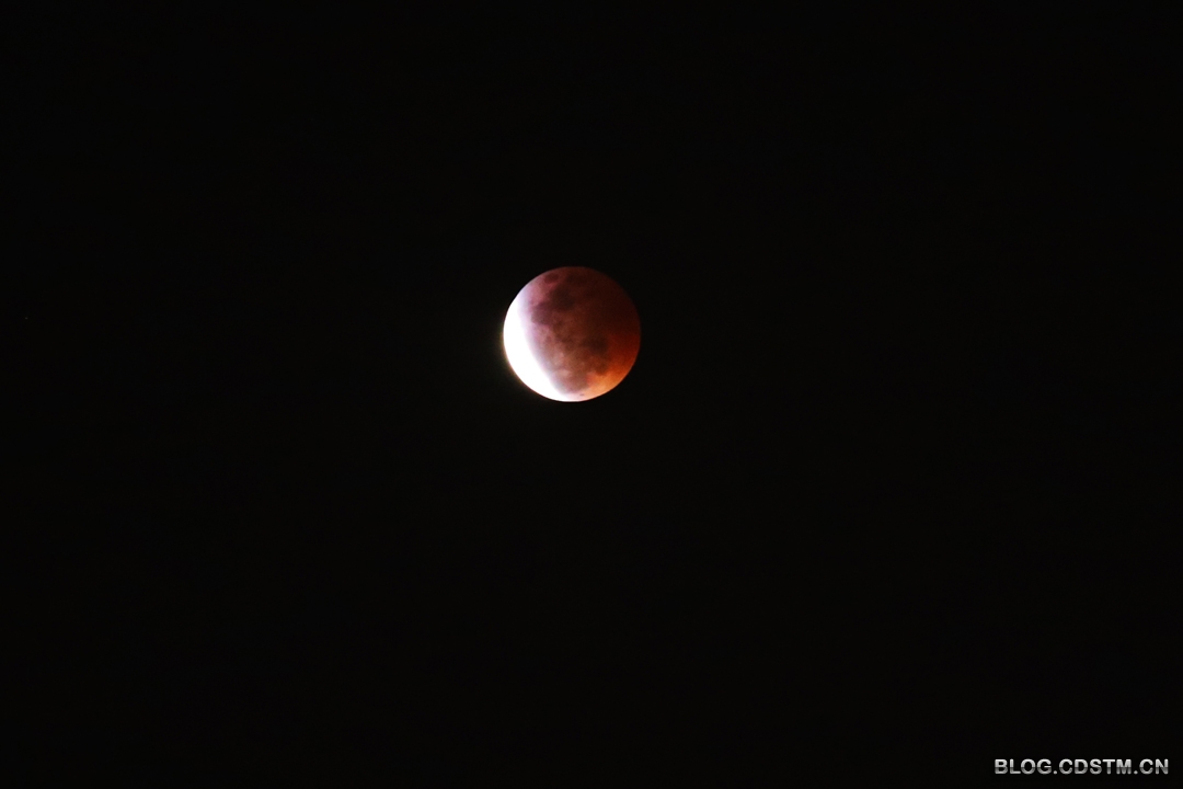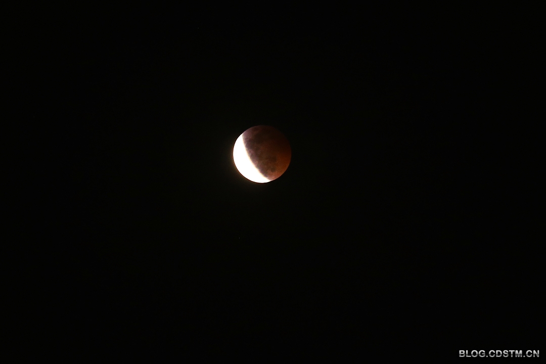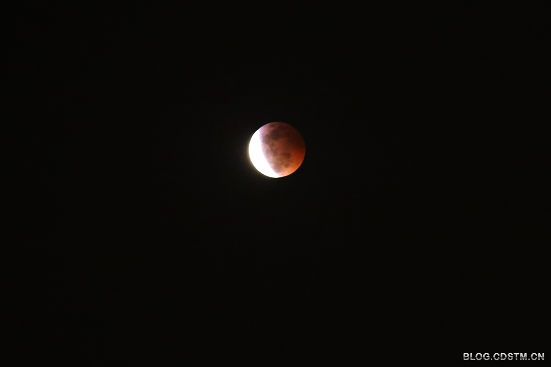 4月4日我赴革命老区百色,得知当晚7点多可看到月全食,于是匆匆吃过晚饭,7点半就赶去右江与澄碧河交汇处的大码头,寻找红月亮。但左等右等,都没见到红月亮的影子,直到8点15分左右,才勉强看到暗红色的月亮的轮廓。因很暗,难聚焦,只好改用自动档,光圈4,速度第1张1/8秒,其余1/10秒,感光度12800。不久,月亮开始复明,出现阴阳月。