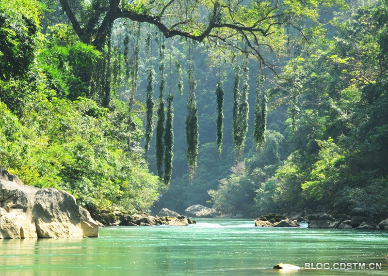 布柳河不仅有仙人桥这一世界奇观,而且原始植被保存得非常完整,沿岸峰峦叠翠,鸟语花香,猿猴不时穿越其间,恰似一个世外桃源。离仙人桥不远,有株大树,树干由北向南延伸,其上垂挂着十多串长达10米左右的寄生植物,犹如一张绿色的帘子。去过那里的人,无不被这独一无二的生态景观所赞叹。