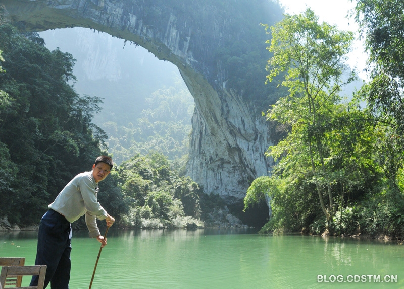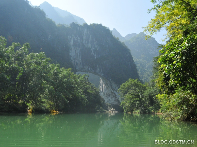 2010年10月20日中午,“跟我游广西广西”一行8人结束凌云之旅后,就要动身前往刚获世界地质公园美誉的天坑之都乐业了。行前,听说乐业之行没有布柳河仙人桥景区。我急了。为什么?因为布柳河仙人桥是世界跨径最大的天生桥,其可观赏性是一流的。天坑群对视觉有很强的冲击力,对心灵有巨大的震撼力,但观赏性还仙人桥更胜一筹。如果不去仙人桥,乐业之行就太遗撼了。后来,经带队的岑桂媛记者协调,仙人桥之旅终于列入日程了,我也乐了。