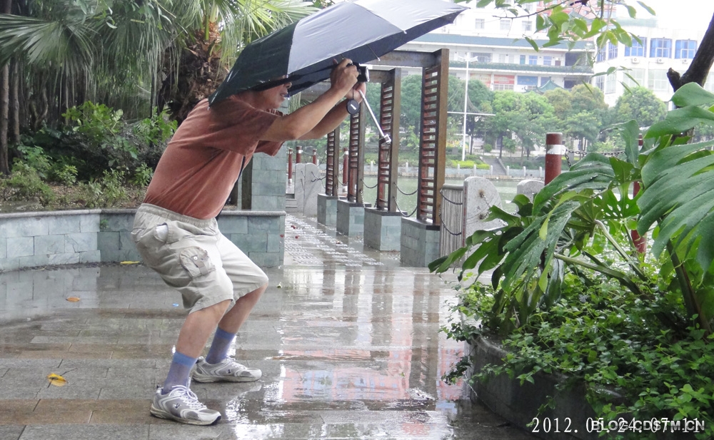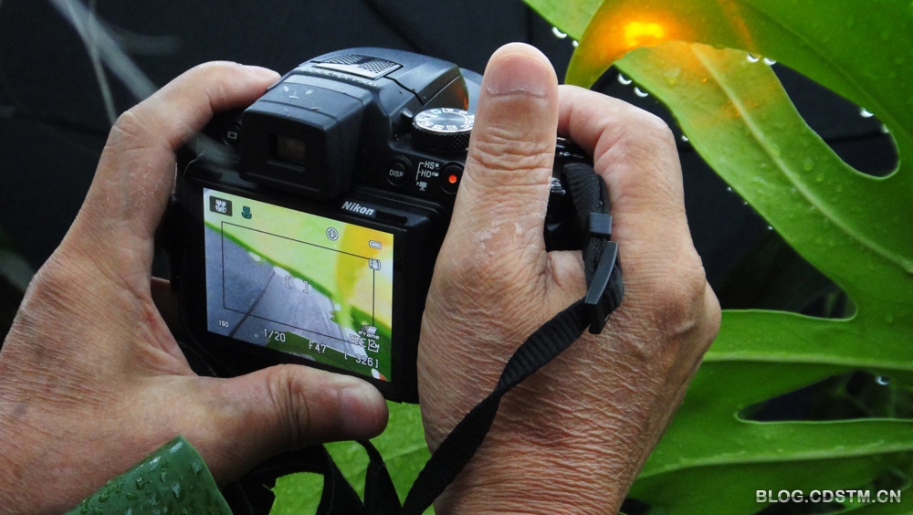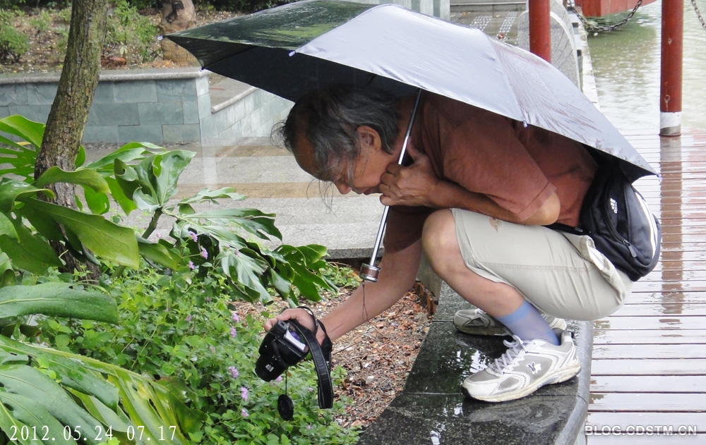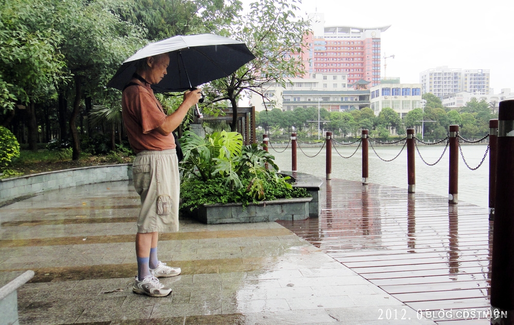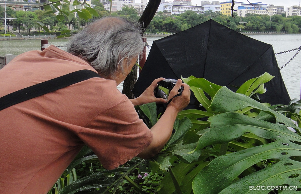 雨时下时停。覃教授是搞美术的,对灰色调很感兴趣,拿出他的尼康P500数码机全神贯注拍了起来。雨没有“下岗”的意思,还在淅沥沥地下,雨水顺着伞缘滴到他的背后,他似乎没有感觉到,有时聚焦小花,有时将镜头对准龟背竹叶片上的水珠,或将地王大厦等景物摄入镜中......