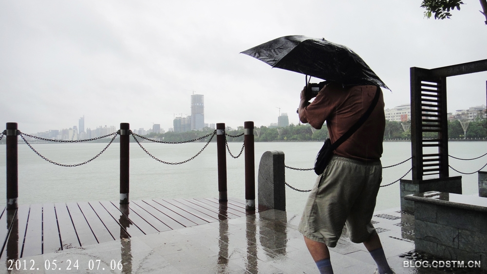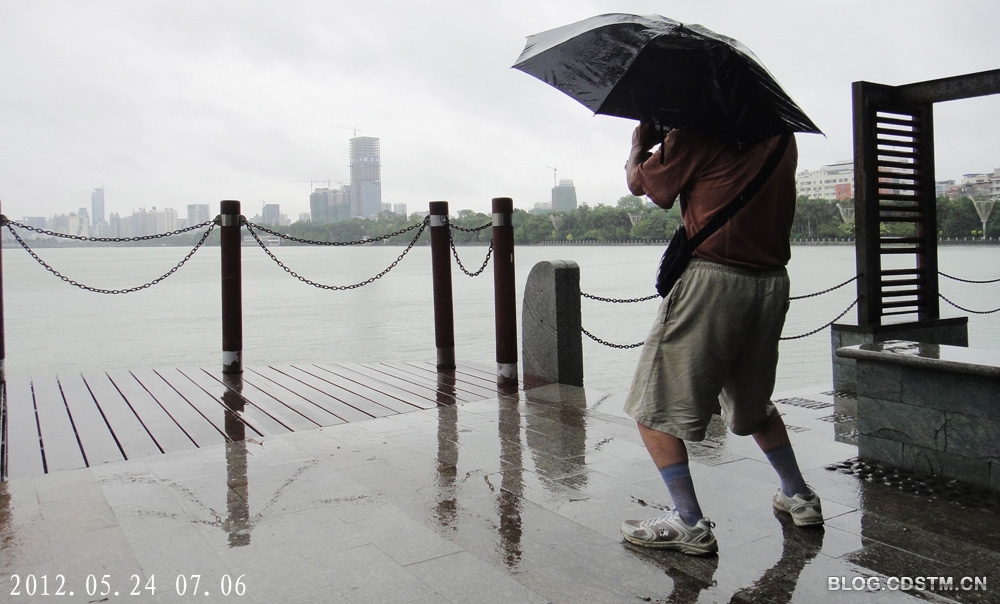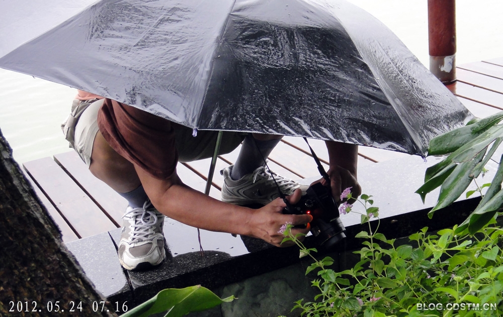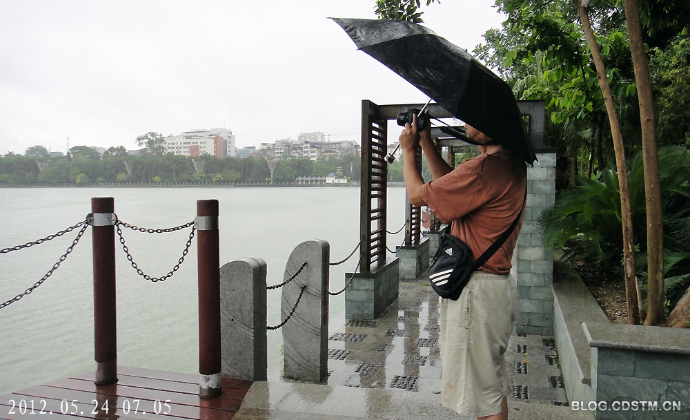 5月24日清晨,天色阴沉,还飘着雨。这样的天气还会有人到南湖拍片吗?我想寻找答案,于是骑上两轮“宝马”,于5点50分到达津头观景台。没人。我相信还是会有人来的,便继续等下去。果然,6点刚过,广西艺术学院的覃忠华教授打着雨伞过来了。