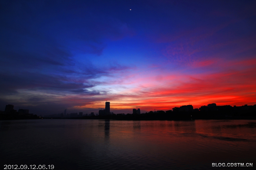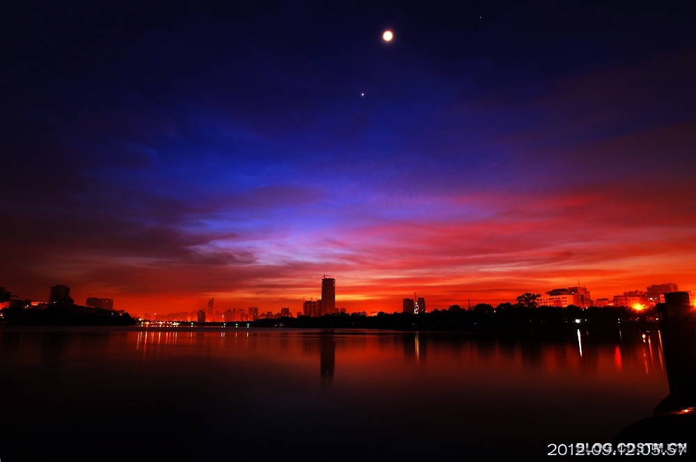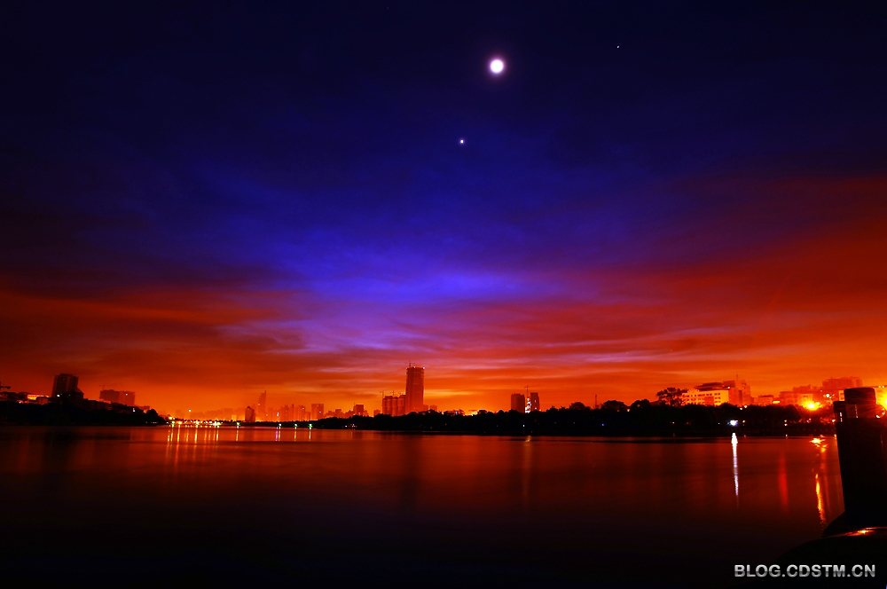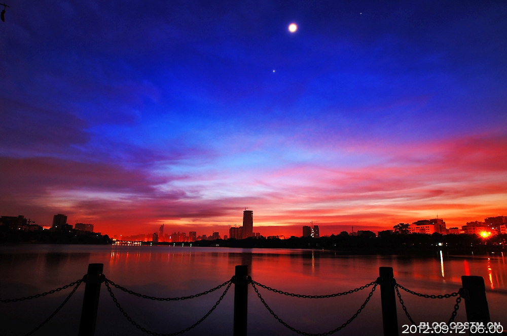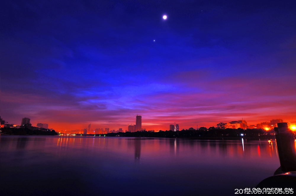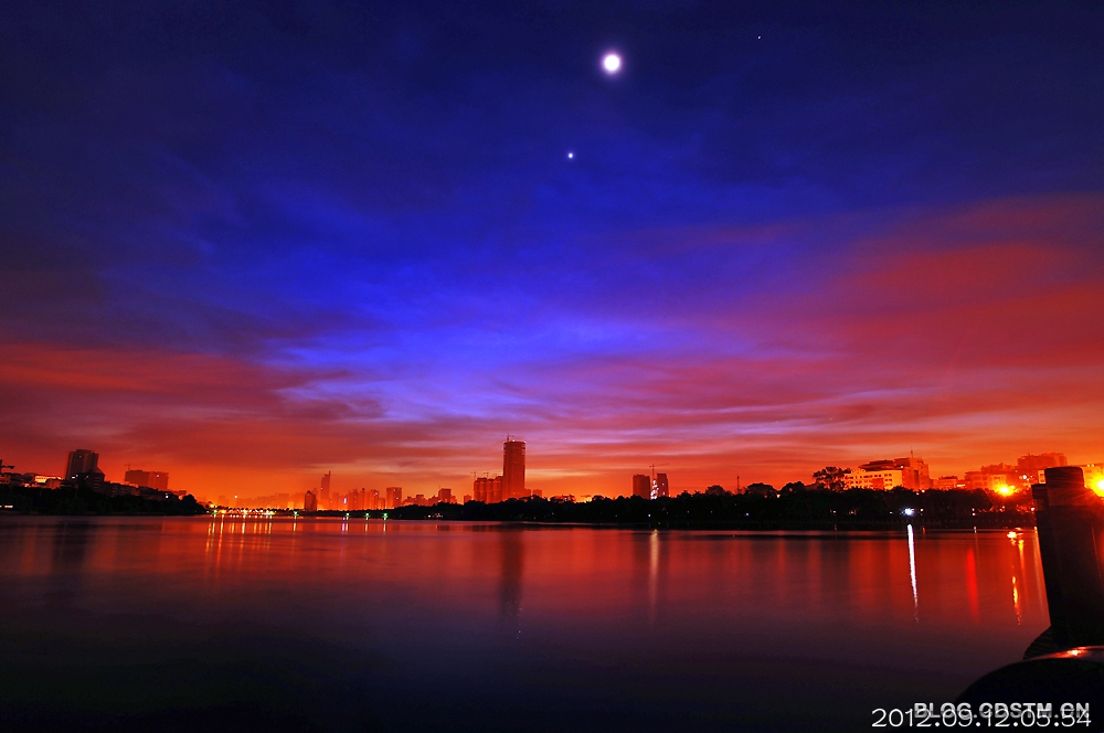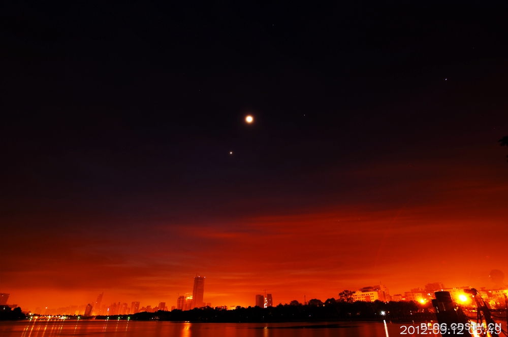 9月上、中旬,南宁天气较好,出现朝、晚霞的天数特别多。今天清晨,又是红霞铺天,与尚未隐去的星月相伴,显得更加秀美。这组照片纪录的是5点49分至6点19分霞光伴星月的情景。