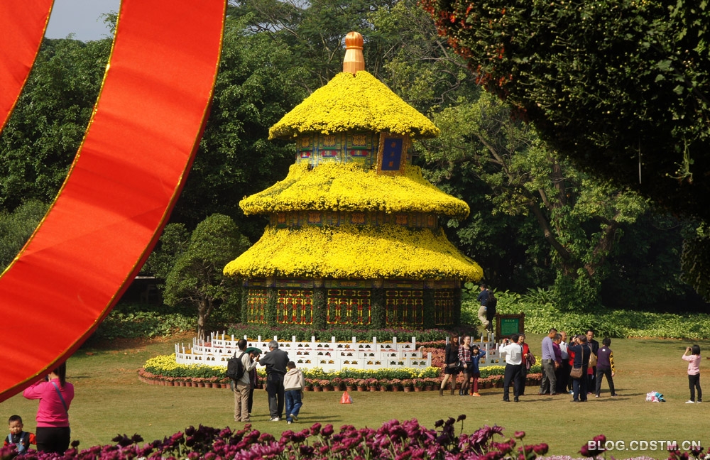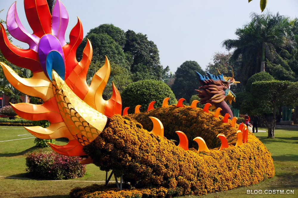 南宁市动物园举办的菊花文化节于11月18日上午开幕。数以10万计的菊花盆堆砌成各种动物模型。孔雀、大象、恐龙、龙凤、12生肖等造型制作得栩栩如生、惟妙惟肖,非常逼真、传神。最具震撼力的是60多米长的金色巨龙,在秋阳下闪闪发光,非常大气、壮观。