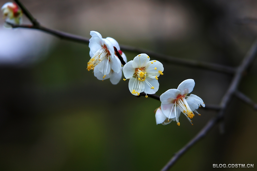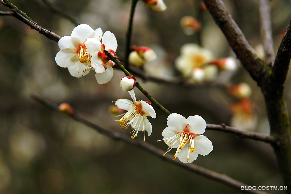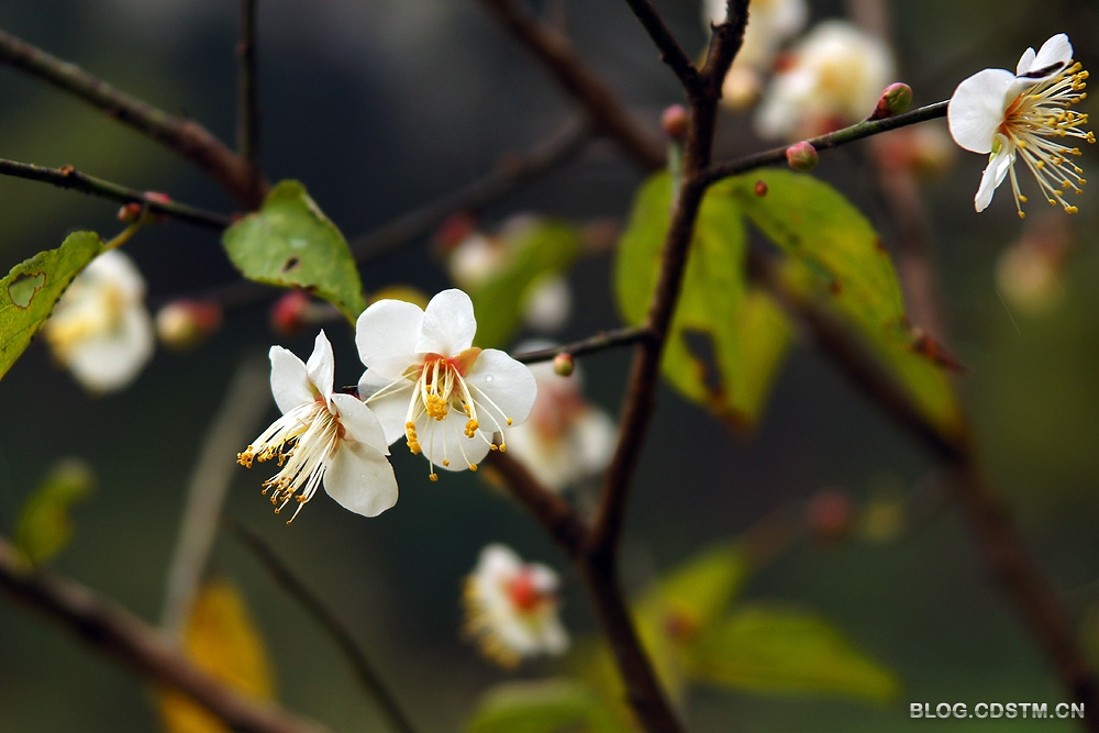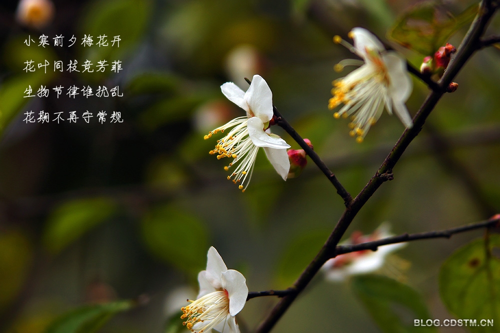 2013年1月3日下午,我到南宁市石门公园踩点,发现那里的梅花已绽放,比2012年早了20多天(2012年1月25日,农历龙年正月初三,我在同一地点拍过梅花),且其中一株竟然花叶同枝,这在往年是看不到的。面对梅花这种反常现象,特写下以下几句以纪之。 小寒前夕梅花开, 花叶同枝竞芳菲。 生物节律谁扰乱? 花期不再守常规。 (注:1.今天虽已是2013年1月3日,但农历仍是龙年十一月二十二,过两天才是小寒,故标题为《龙年梅花二度开》。2.我的QQ相册中有28张2013年1月3日拍的梅花图,欢迎浏览指导。)
