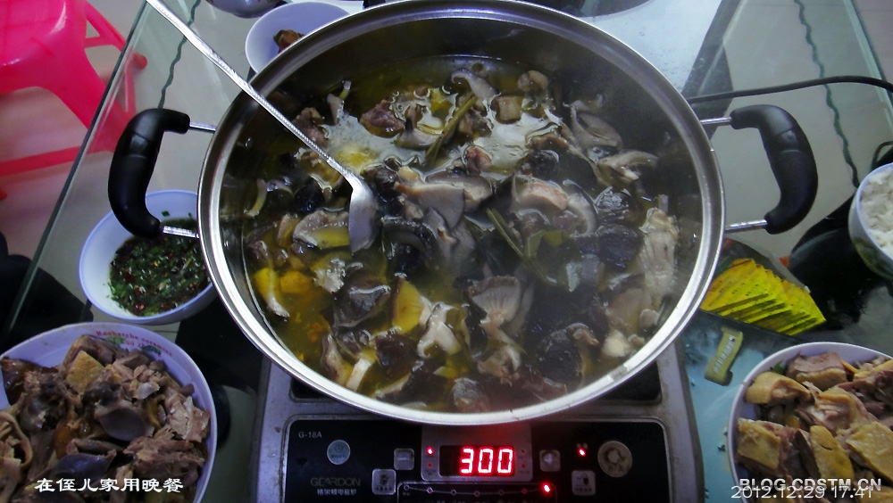 2012年12月29日至31日,我有事回老家(广西乐业县),在侄儿和表弟家用餐,吃的都是地道的原生态绿色食品,不加任何化学调味品。煮鸡加野山姜,煮鸭加香茅。主食是木桶蒸糯饭。不论是菜还是饭,都香气四溢,令胃口大开。我儿子直说好吃,在城里从没吃过味道这么好的饭菜。虽然菜式不如城里高级餐馆做的赏心悦目,但却是原汁原味,口感并不亚于宾馆名厨做的美味佳肴。