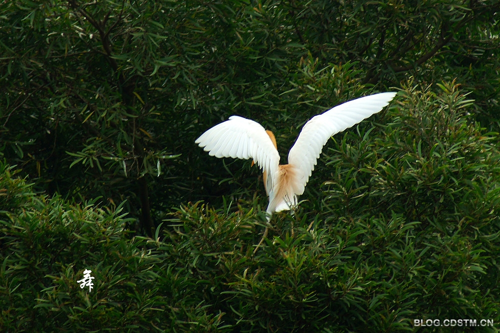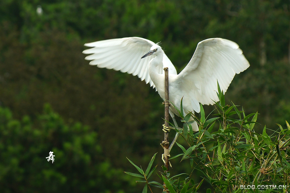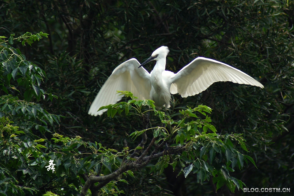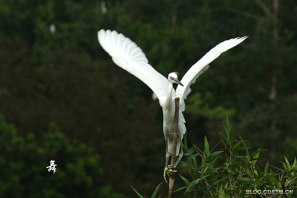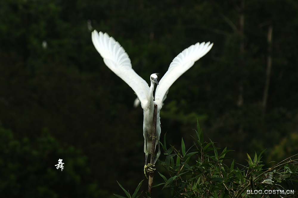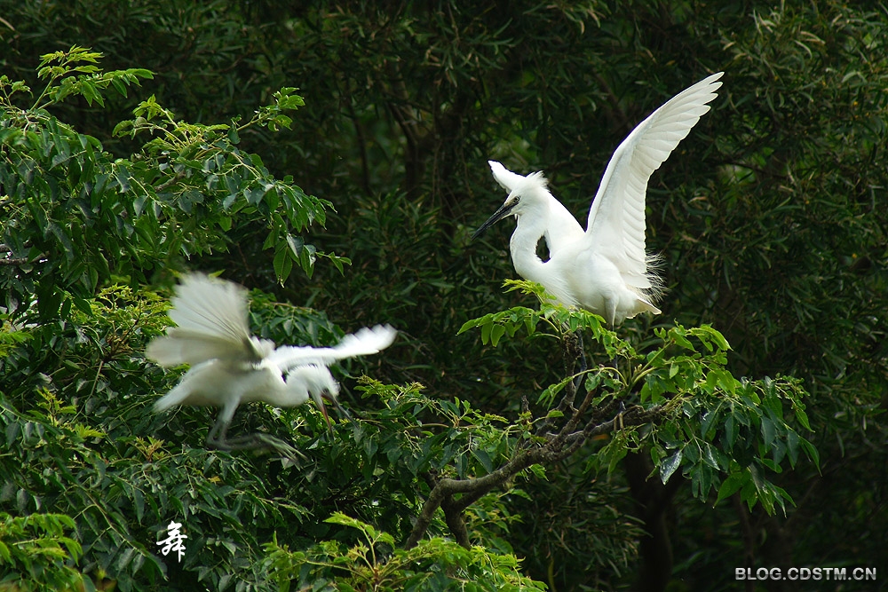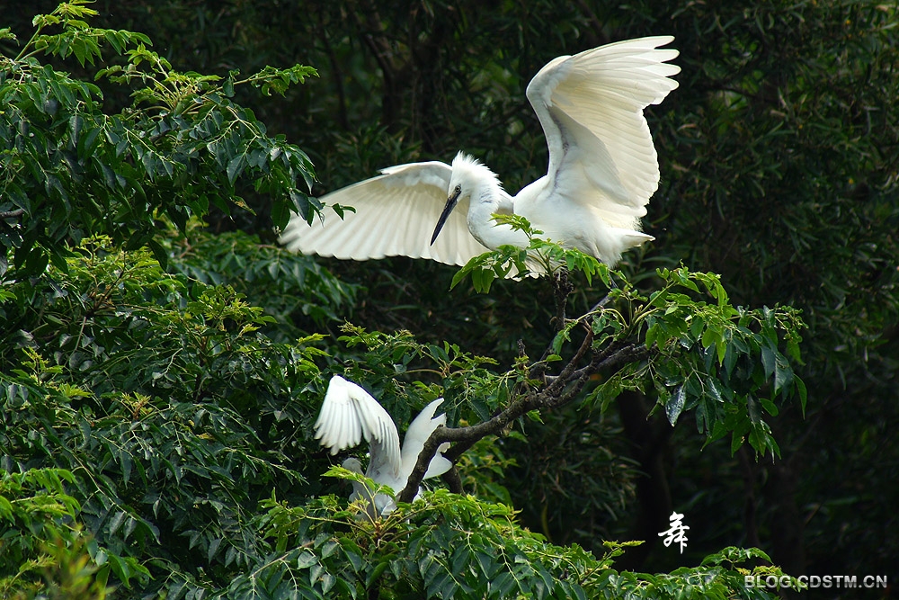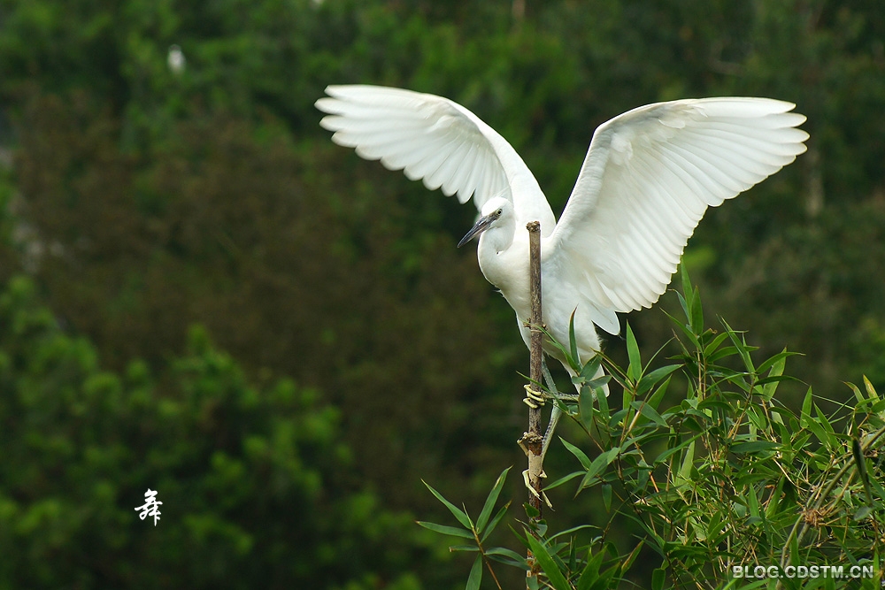 白鹭在枝头上展翅,翩翩起舞,给人以美的视觉享受。